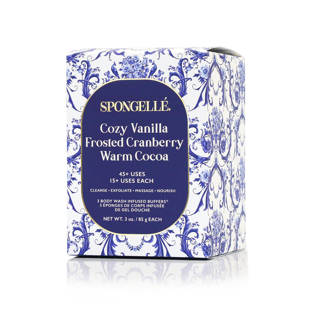 Body Buffer Trio Set includes 3 full size Body Wash Infused Buffers in Cozy Vanilla, Frosted Cranberry, and Warm Cocoa. Each pre-filled body wash buffer is good for 15+ uses each.