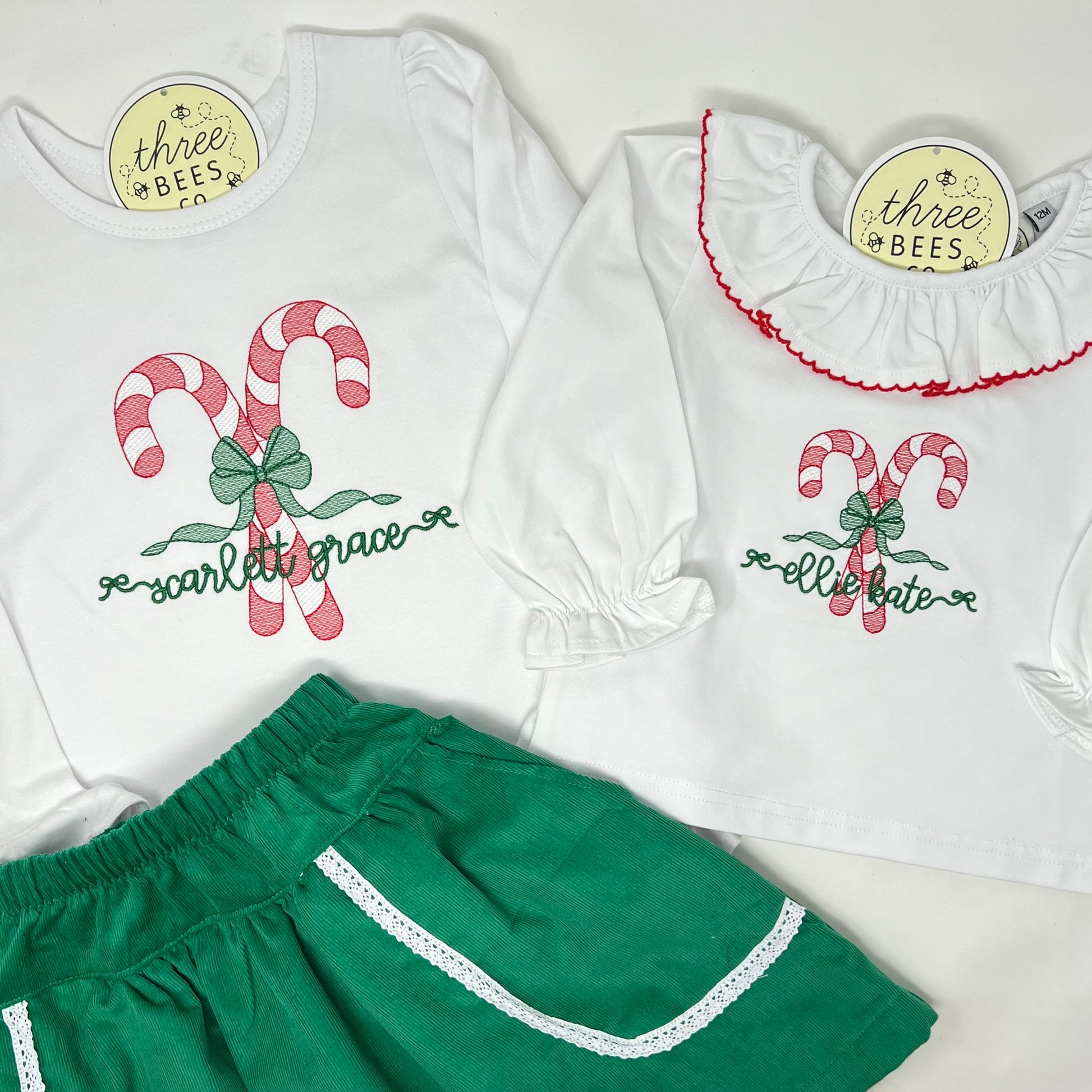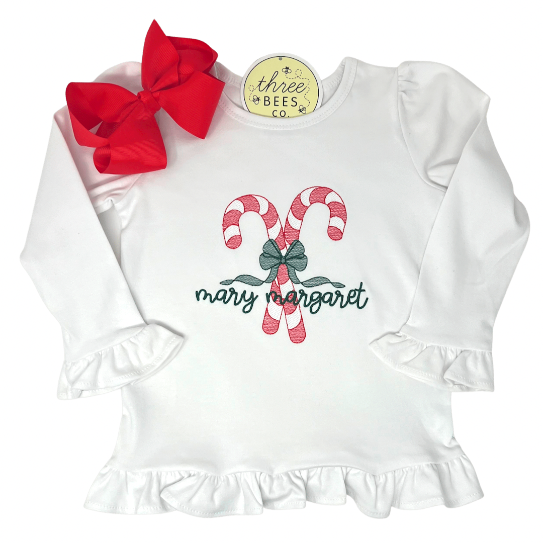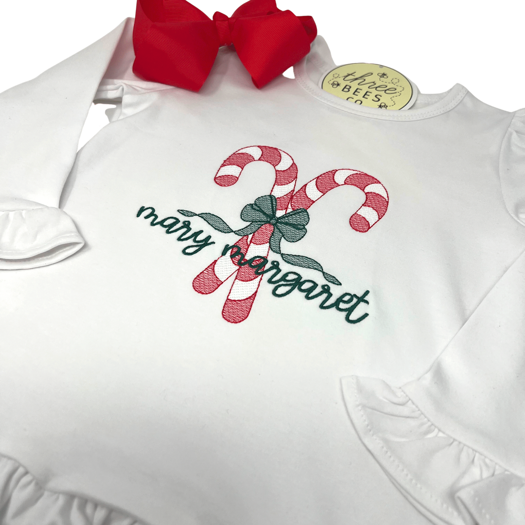 This Candy Cane Sketch Design Girls Top features a charming candy cane embroidery design with a delicate bow, adding a festive touch to any outfit. Personalize it for a unique and special touch. Made with high-quality materials for comfort and durability.