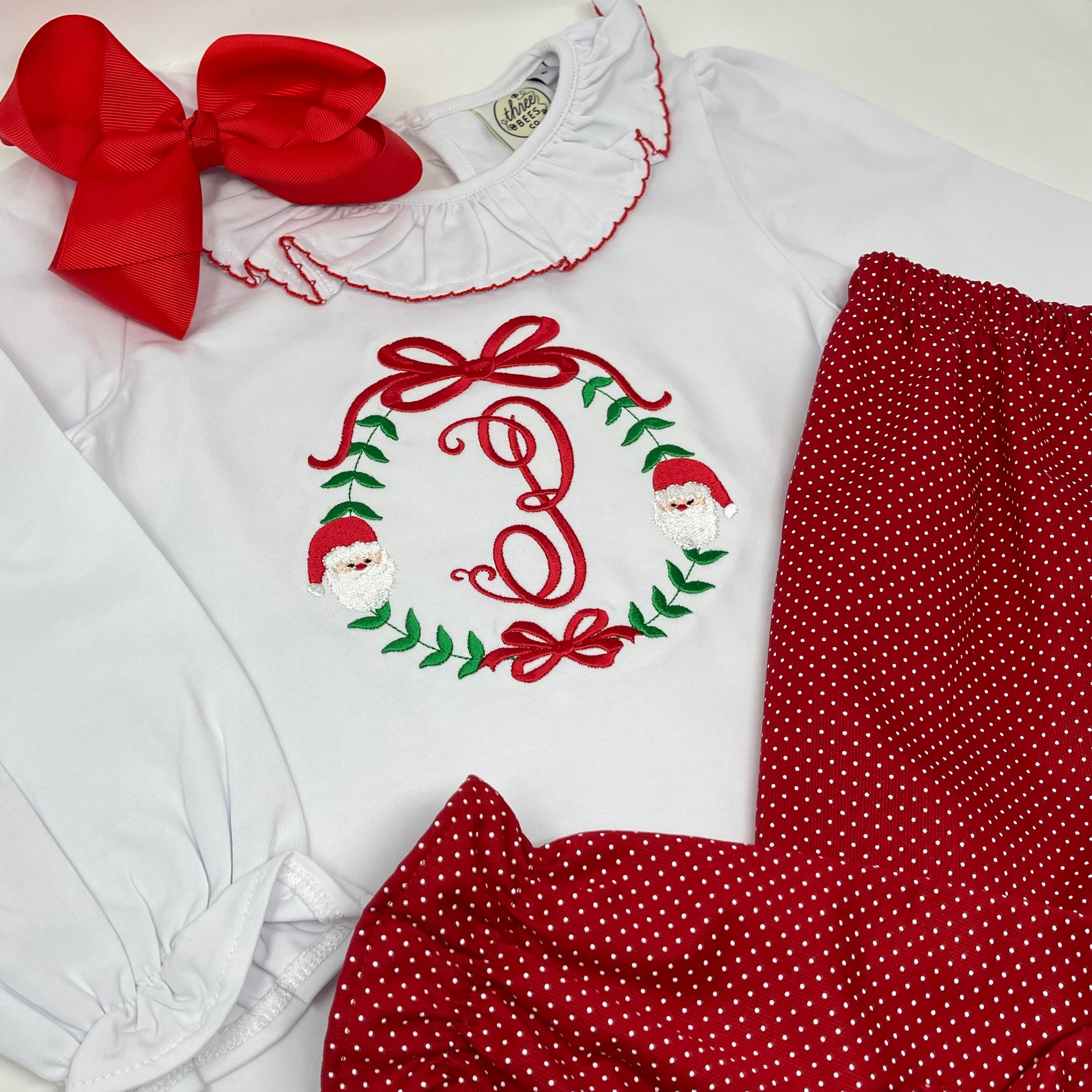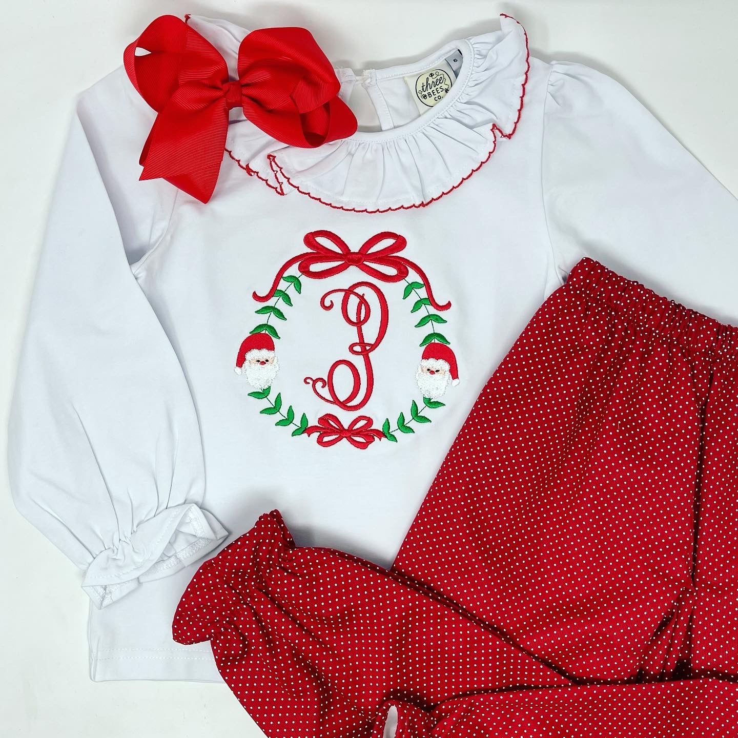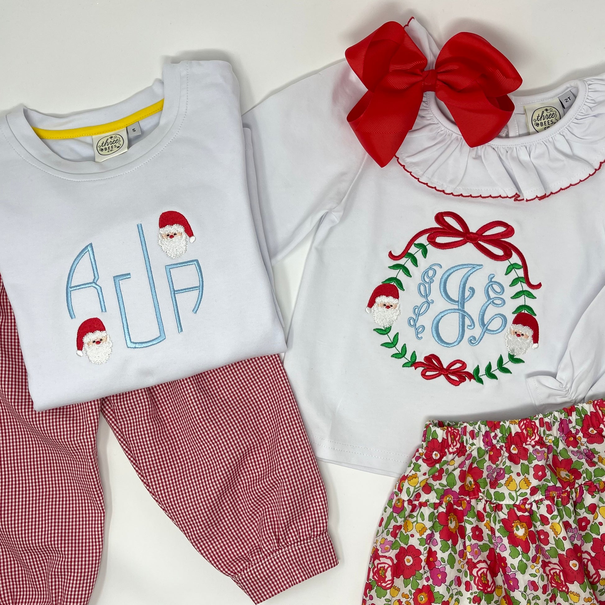 Our Christmas Wreath Frame with Bows Embroidery Girls Top is perfect for your little one. Choose your favorite style top, add a monogram or single initial and she'll be set all Christmas season long!