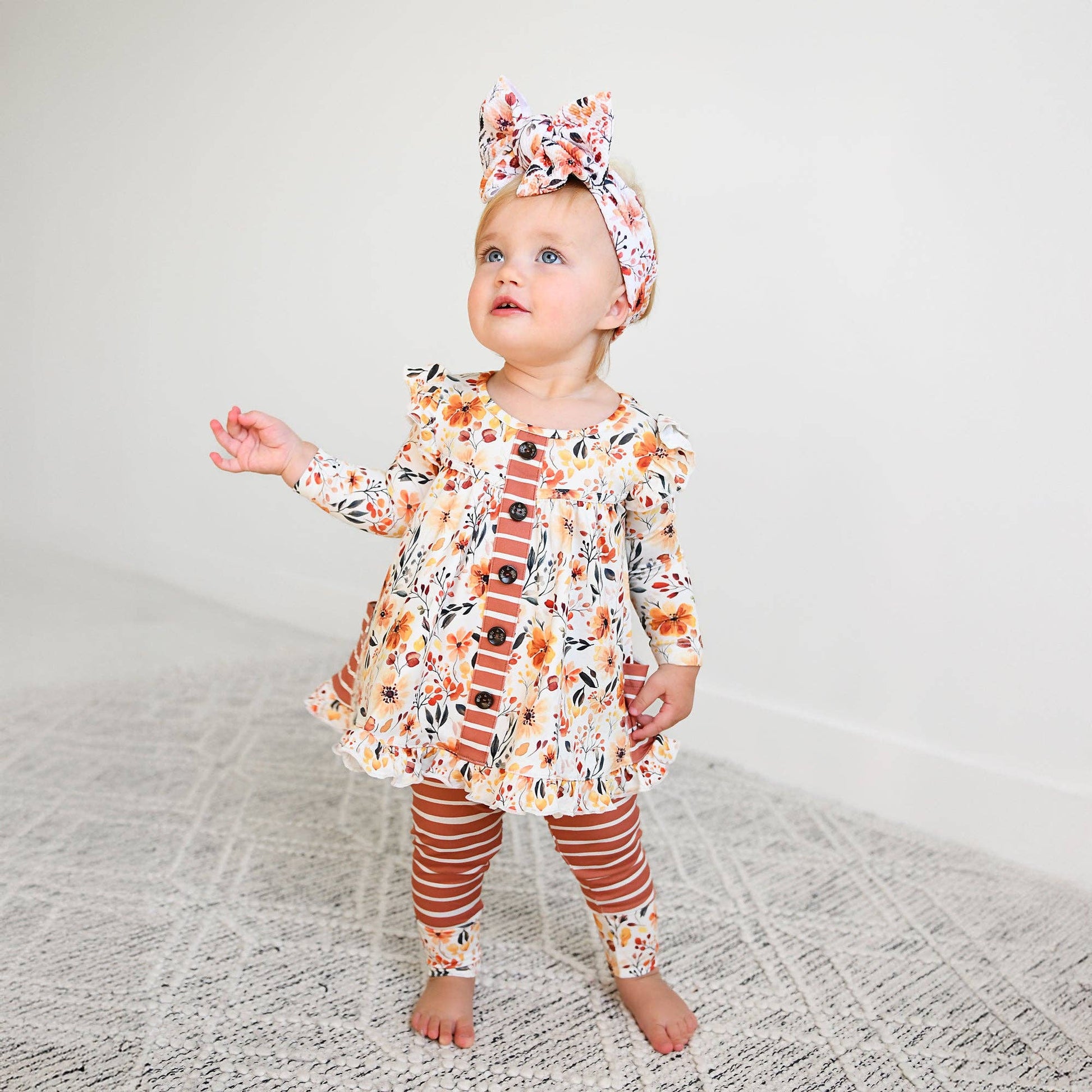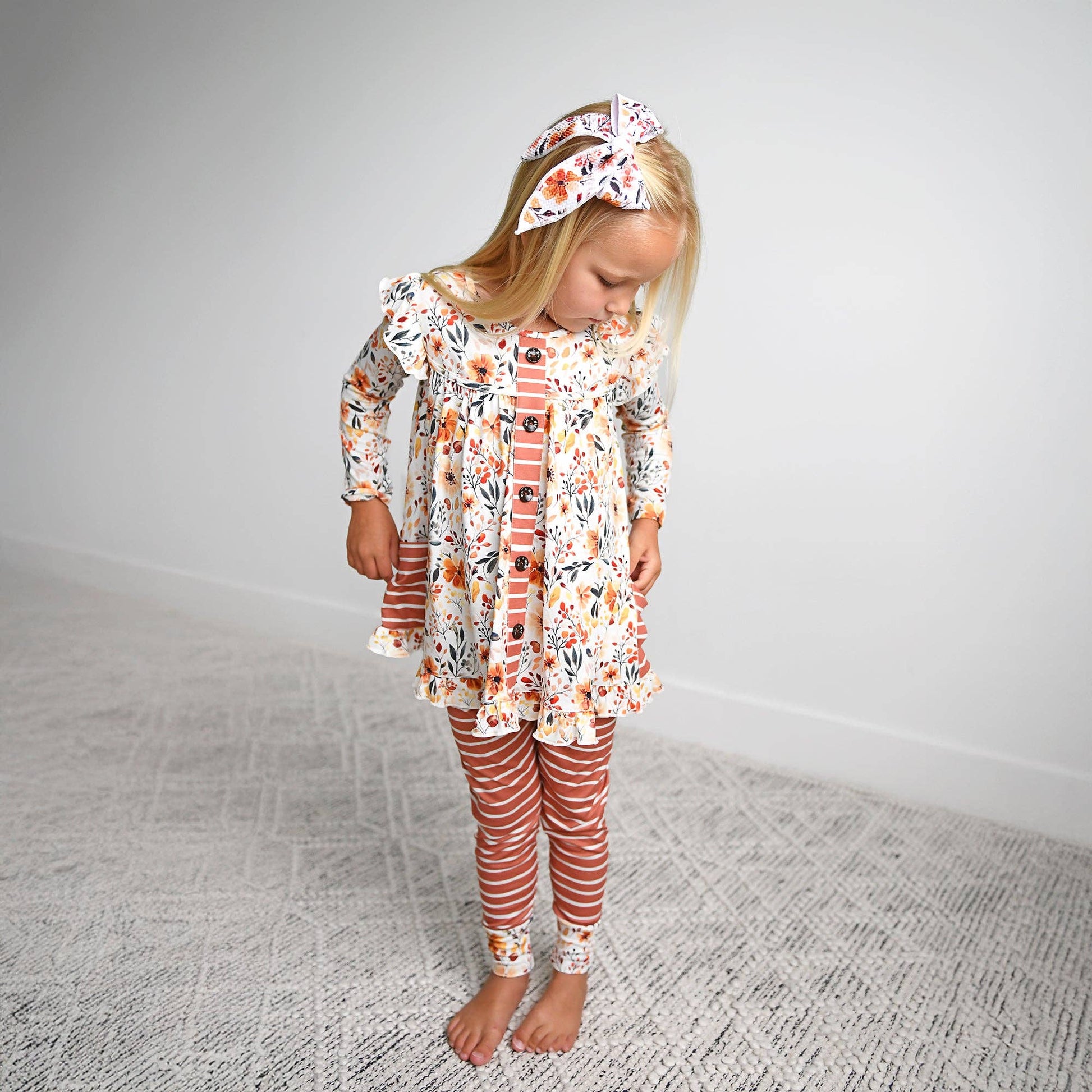 This adorable outfit is a must have for your little cutie, it's super soft and so comfortable! The fabric we used is super stretchy and breathable, wait until you feel how soft it is! Made from a polyester/spandex blend, this fabric is a little thicker so the body of the peplum has some volume. It lays so nicely! This set is not made from bamboo These run about one size big, please size down if you want a true fit now. We do not recommend sizing up with this set. Sizes available :