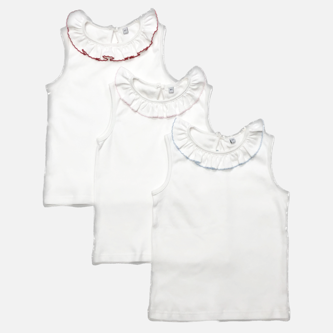 Our Bee Basic Picot Ruffle Sleeveless Top in premium cotton is soft and perfect for summer. Pairs with all Three Bees Co. bottoms. Choose between our blush pink, light blue or red picot stitch trim.