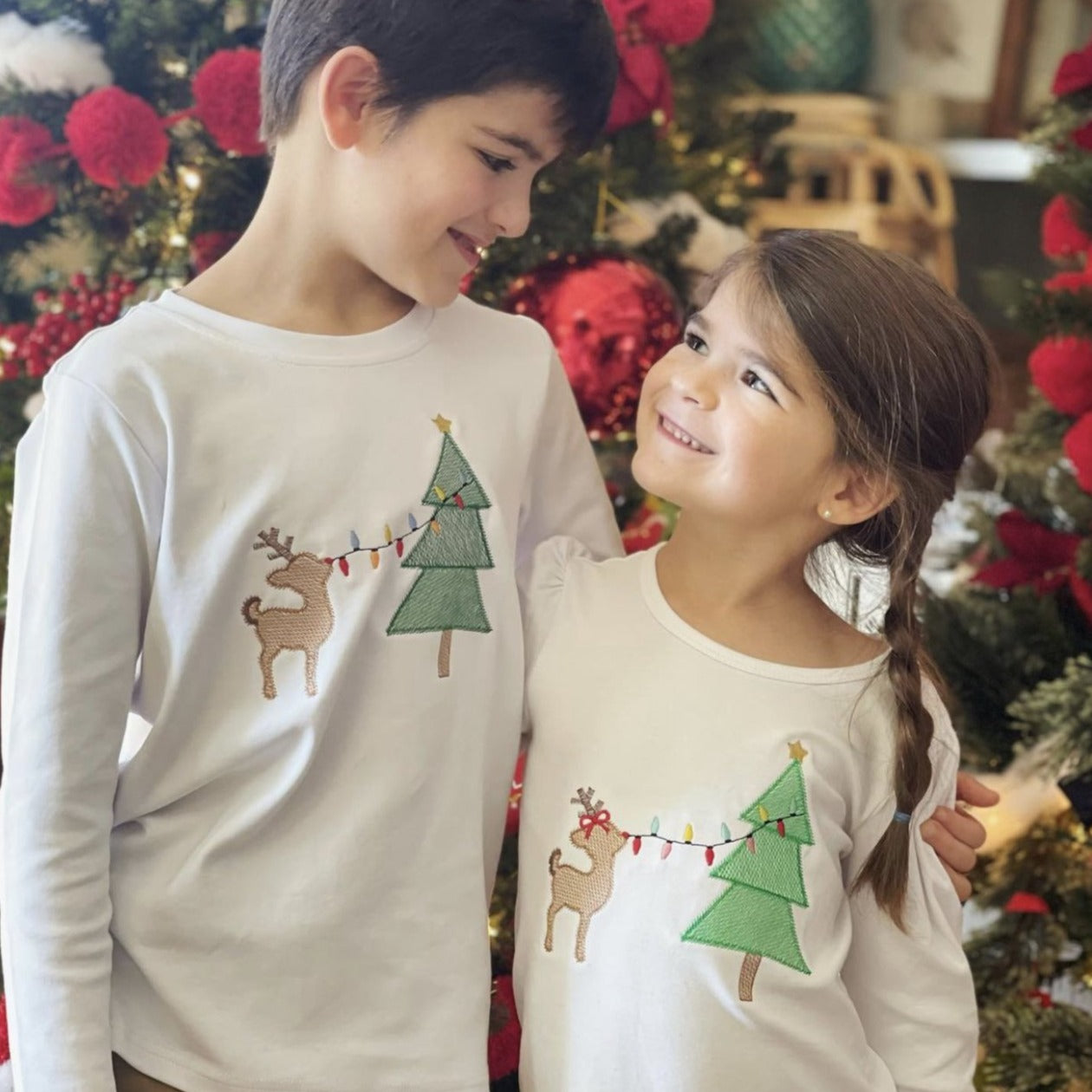 Our Reindeer Stringing Lights Embroidery Girls Top is perfect for your little one. Choose your favorite style top, add a name and she'll be set all Christmas season long!